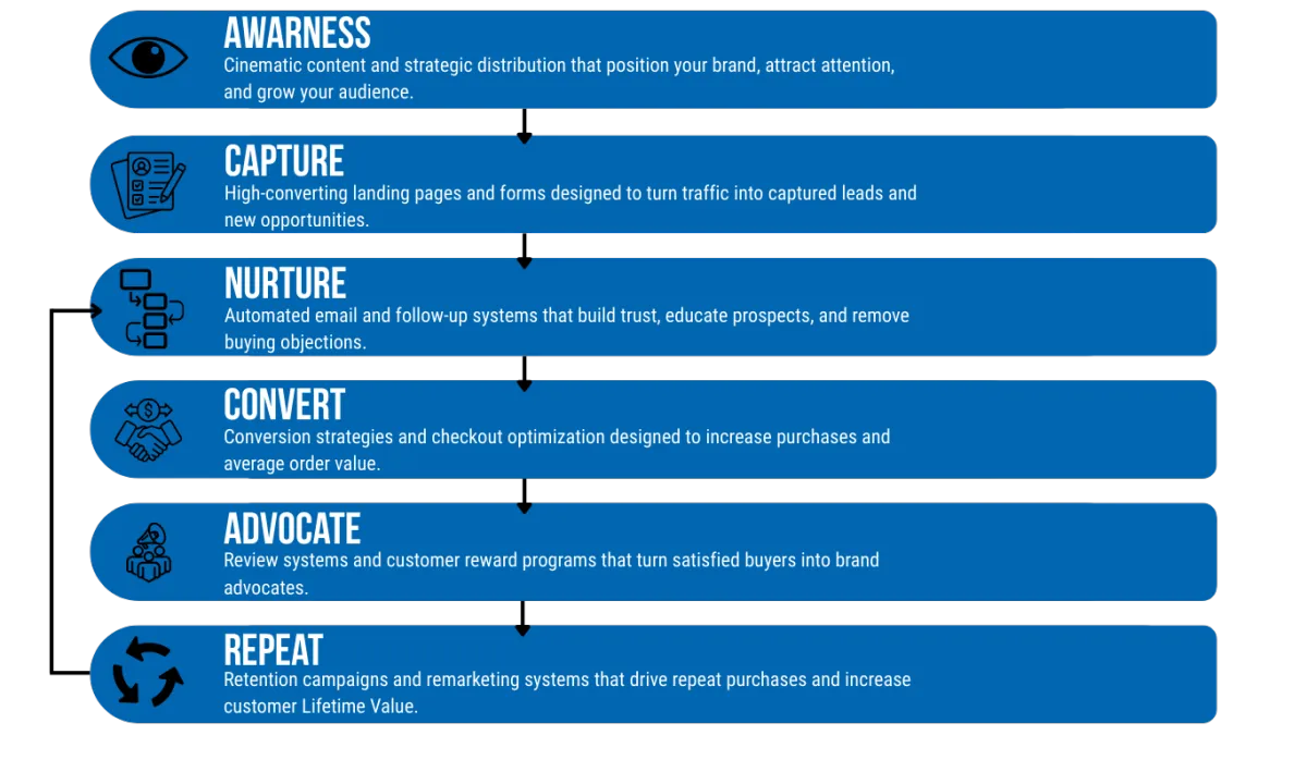 The Crown Sage Marketing System connects content, paid advertising, automation, and conversion strategy so every stage of the customer journey works together to move prospects from first impression to loyal customer.